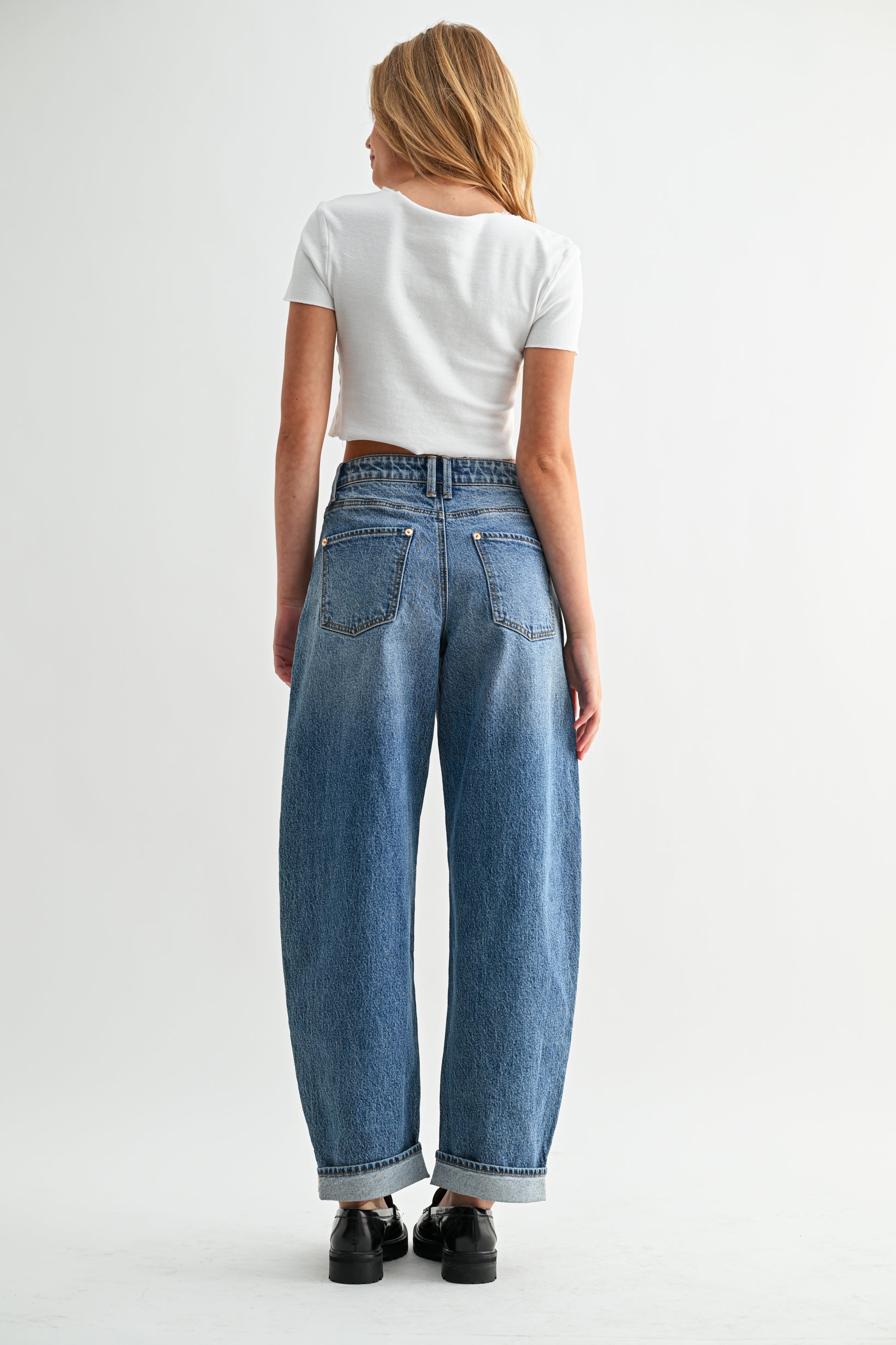 Our new must-have fit. These high-rise jeans feature a curved leg for a subtle, playful silhouette. Wear them cuffed at the ankle for a casual look or unroll for a longer, statement-making inseam.